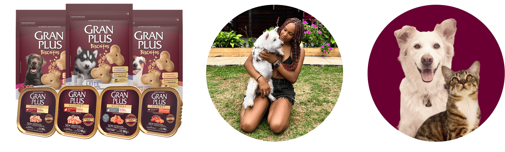 Rebeca Andrade escolheu GranPlus para seus pets, destacando qualidade e sabor.
